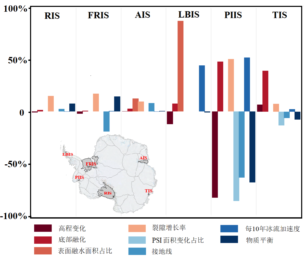 此外,研究选取了南极已经崩塌的拉森B冰架、处在快速变化且已发生结构性变化的松岛冰架和处于加速状态的托滕冰架作为参考冰架,将三大冰架与参考冰架对应的关键参数进行对比分析,最终确定南极三大冰架的变化状态和稳定性趋势。研究结果表明,三大冰架的多项关键参数与参考冰架相比均变化较小。