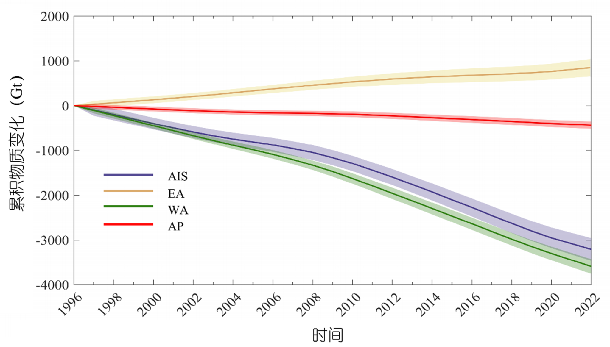 文章首次利用来自8家国内机构提供的16个物质平衡结果,估算了1996年至2021年南极冰盖及其各区域的综合物质平衡,结果表明南极冰层在此期间共损失了约3213±253 Gt的冰物质,相当于约8.9±0.7 mm的全球海平面上升贡献量。