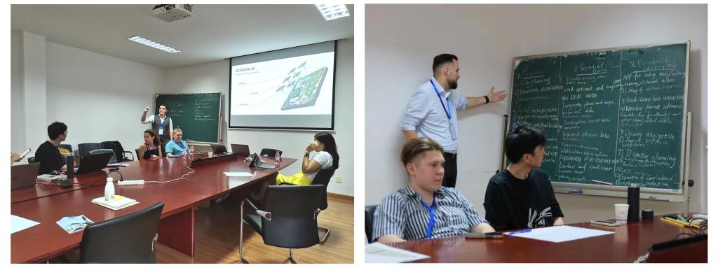 本次3S暑期学校设立两门专题课程:三维数字建模、空间数据服务城市管理,分别由来自挪威科技大学的范红超教授和来自莫斯科国立测绘大学的Sergei Shestakov教授和Aleksei Kurlov教授进行讲解。课程授课方式为全英文,内容分为理论知识与实践锻炼两个部分,参加的学员根据自己的兴趣选择专题课程。每个课程组内进一步分成合作小组,小组成员一起学习讨论,完成课程项目,总结和分析实验结果,然后根据课程老师给出的意见和建议汇总和修改,并在最后的结业典礼上以小组形式展示项目成果。