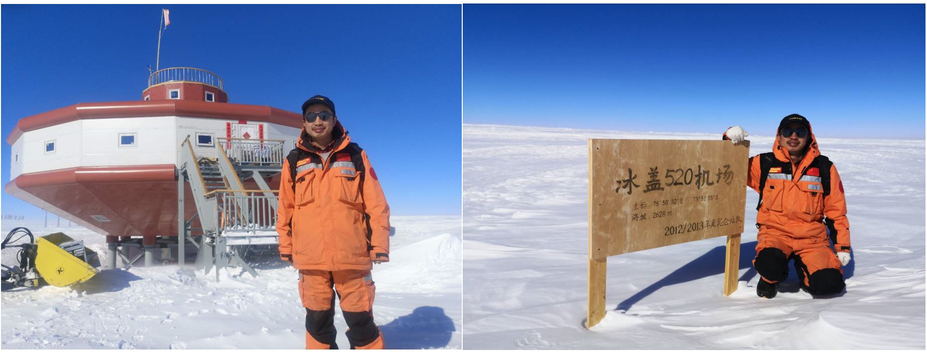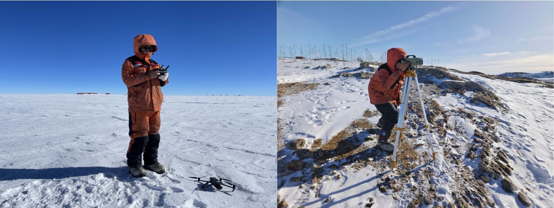 4)博士生谢陈雨参加中国第40次南极科学考察 博士生谢陈雨于2023-2024年间参加中国第40次南极科学考察,作为首位“00后”内陆队员,前往南极内陆格罗夫山地区,针对物质平衡关键参数及冰雪表面特征进行高精度测绘研究。考察期间,开展高精度无人机航空摄影测量,联合全波段地面光谱仪与光学卫星及无人机同步测定冰雪表面光谱曲线,通过地面及低空冰雷达探测冰雪浅层结构特征,基于高精度GNSS测量冰雪表面三维坐标等科学研究。基于国产高分辨率遥感卫星数据对格罗夫山地区行进路线以及麒麟冰下湖探路选线提供技术支持,为考察队安全行进做出了贡献。
